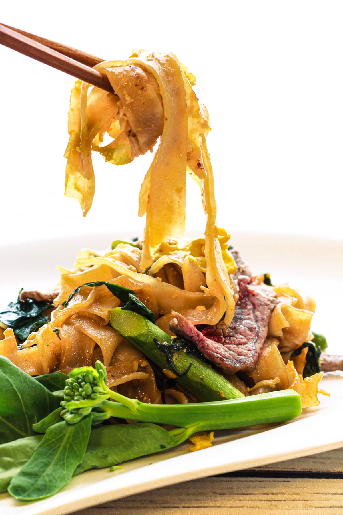 This popular Thai street food, Pad See Ew (Stir Fried Noodles), is a Chinese-influenced, stir-fried rice noodle recipe that is very popular in Thailand. The Chinese broccoli, and sweet and salty sauce puts this easy Thai dish over the top!