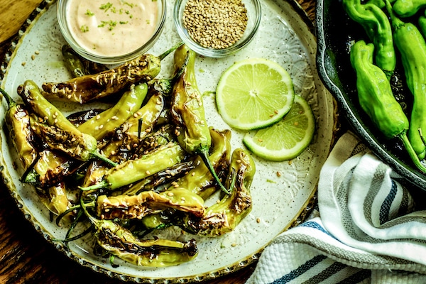 Blistered Shishito Peppers with Sriracha Aioli