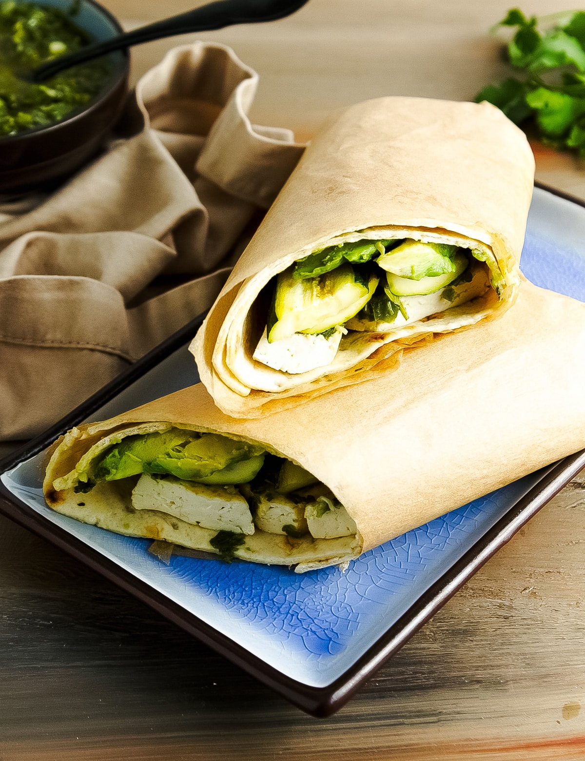 Sliced tofu and zucchini are oven-grilled, then enveloped in a soft, lavash flatbread layered with creamy avocado slices and a punchy, herbaceous chimichurri sauce. So delicious! (Vegetarian and vegan.) Click here for the full recipe.